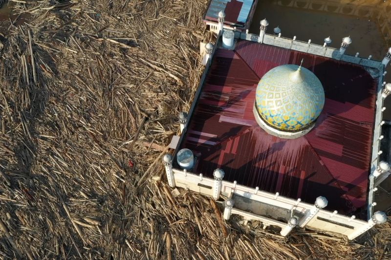Foto udara menampilkan tumpukan kayu-kayu memenuhi area Pondok Pesantren Darul Mukhlishin pascabanji...